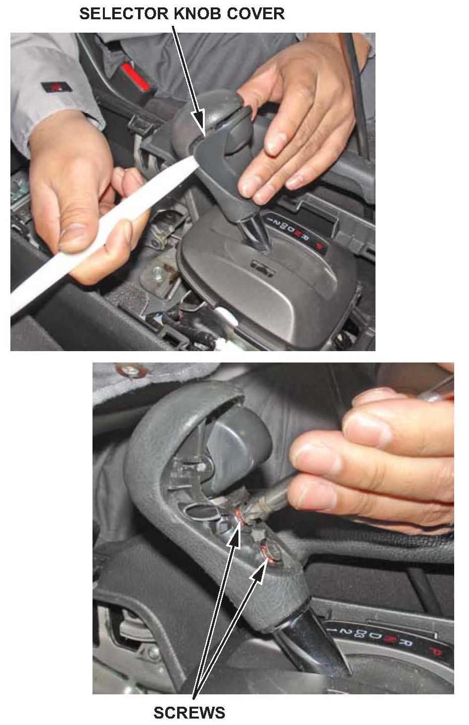 2. Pry off the selector lever knob cover with the appropriate trim tool. Remove the two screws, and lift the shifter lever knob off the lever.