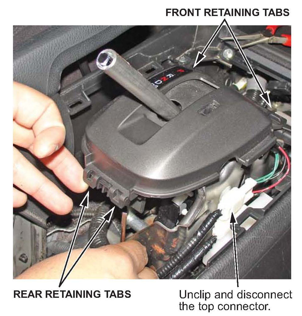 7. Type B shift lever: Remove the A/T gear position indicator panel by gently prying up on the four retaining tabs that secure the panel to the base.