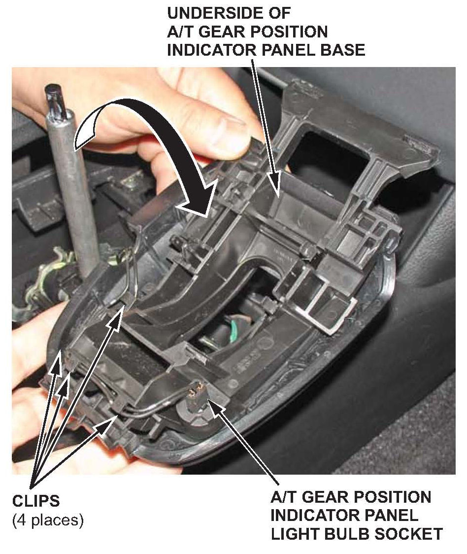 5. Type A shift lever: Turn the panel and base over, and remove the A/T gear position indicator light bulb socket. Remove the wiring from under the clips.