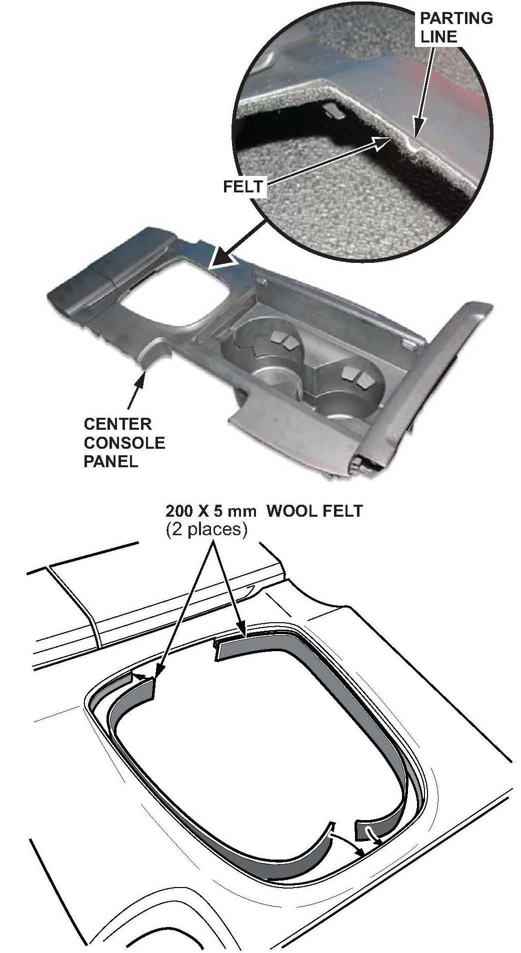 14. Inspect the felt on the center console panel for proper installation. Make sure the felt is properly attached and in the correct position (touching the parting line). If any of the felt is not in contact with the console panel, or is not touching the parting line, replace it by cutting a 200 mm x 5 mm piece of felt and applying it as shown.