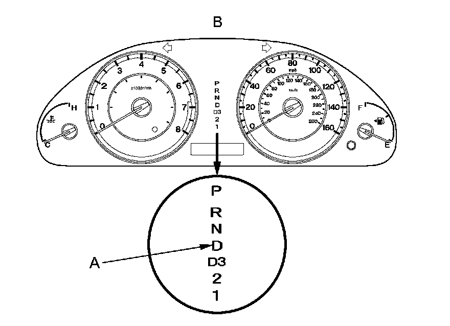 When the powertrain control module (PCM) senses an abnormality in the input or output system, the D indicator (A) in the gauge control module (B) will usually blink.