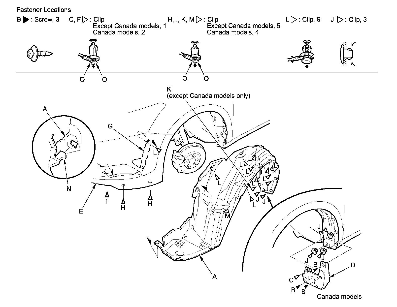 3. From the wheel arch, detach the clips (I, J, K, L) that secure the front inner fender (and the splash shield) to the body.
