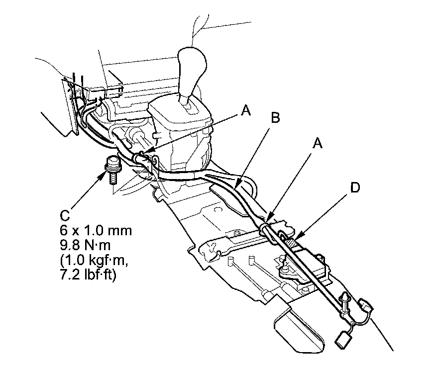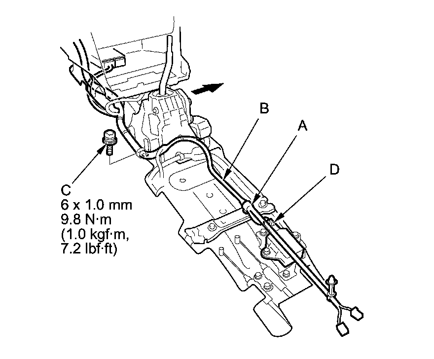 7. Detach the harness clip(s) (A) fastening the dashboard wire harness (B), and remove the ground bolt (C) with a TORX T30 bit. Disconnect the yaw rate-lateral acceleration sensor connector (D).