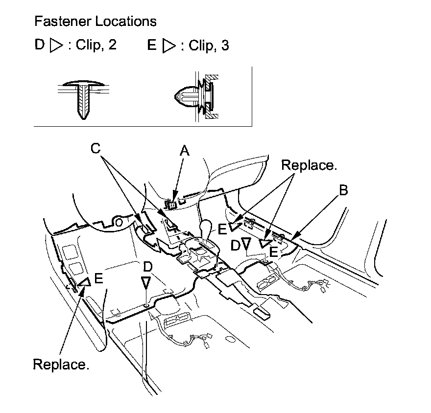- Replace the clips fastening the carpet to both door sill areas with new ones.