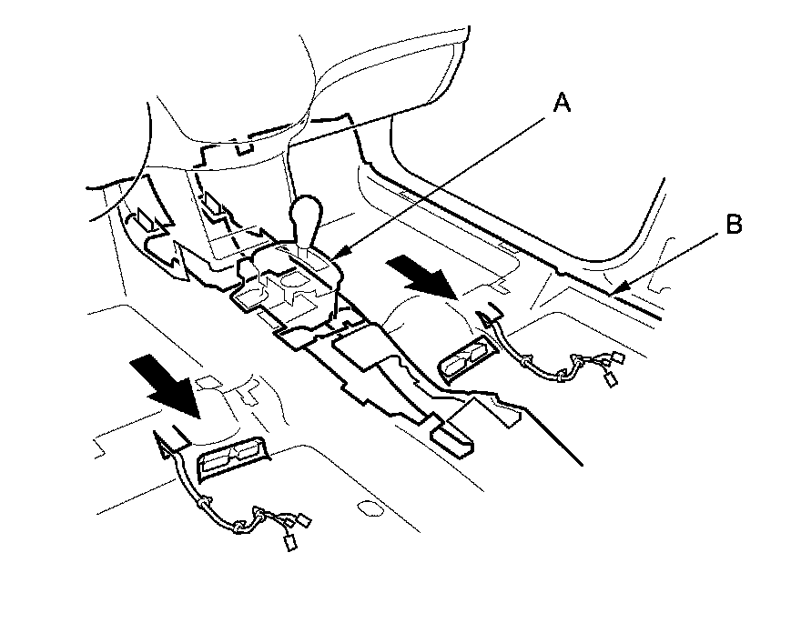 10. While lifting up the shift lever (A), pull out the carpet (B) from under the dashboard, then remove the carpet.