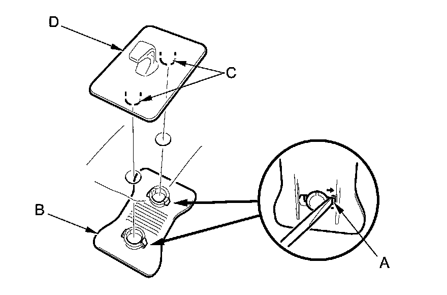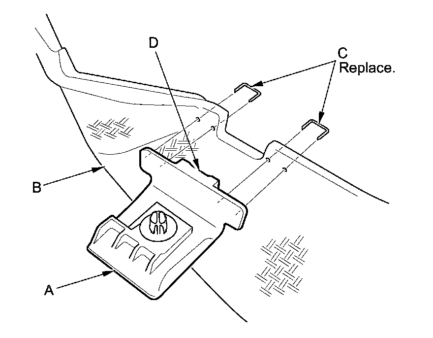 11. If necessary, from back of the carpet, release the hooks (A) of the base (B) with a flat-tip screwdriver, and push up the projections (C) of the floor mat holder (D) from the base to remove the holder.
