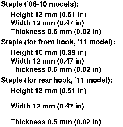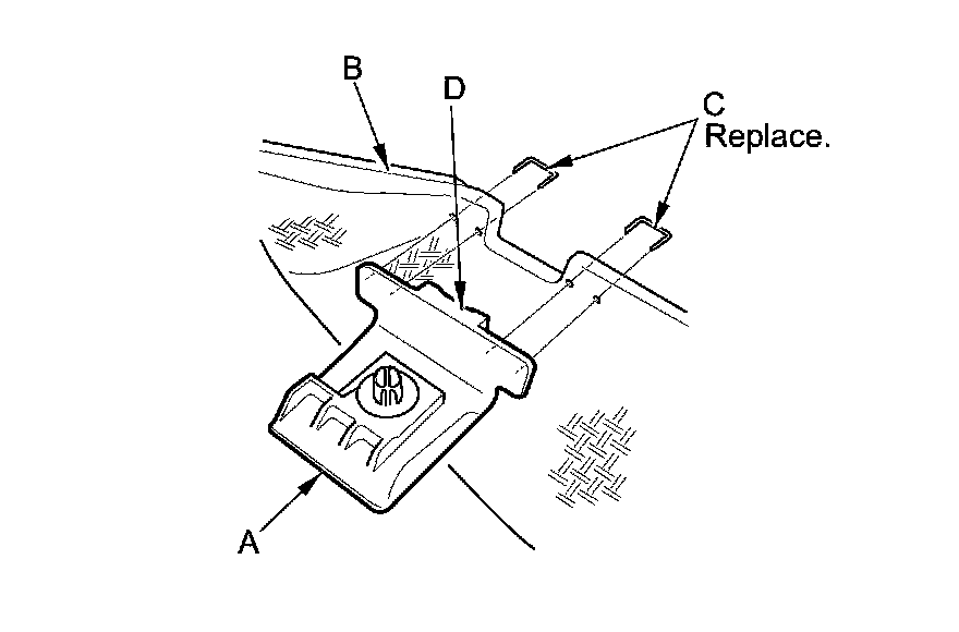 13. If the hook (A) is removed, reinstall the hook to the carpet (B) with new staples (C); fit the projection (D) of the hook to the notch in the carpet, then staple the hook. Bend the projected staple with a flat-tip screwdriver.