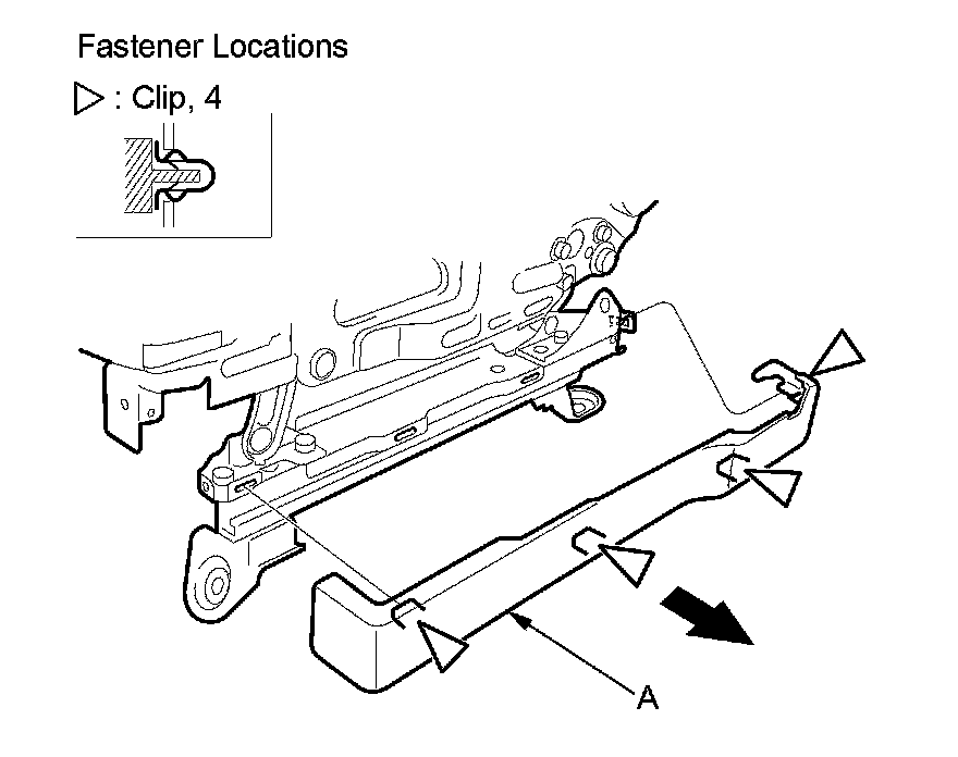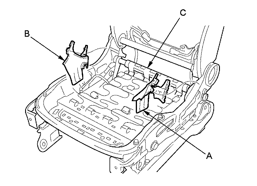 5. Remove the recline inner cover (A) and the center inner cover (B) from the seat frame (C).