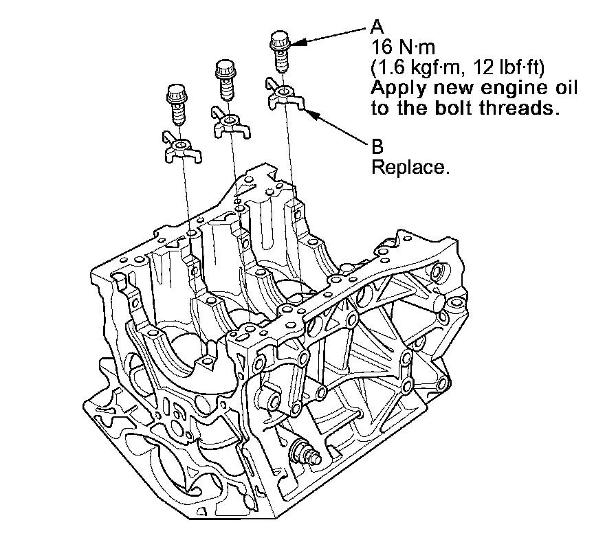 2. Remove the oil jet bolt (A), then remove the oil jet (B).
