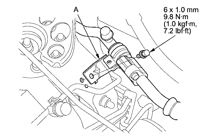 2. Remove the bolt from the A/C line clamp (A).