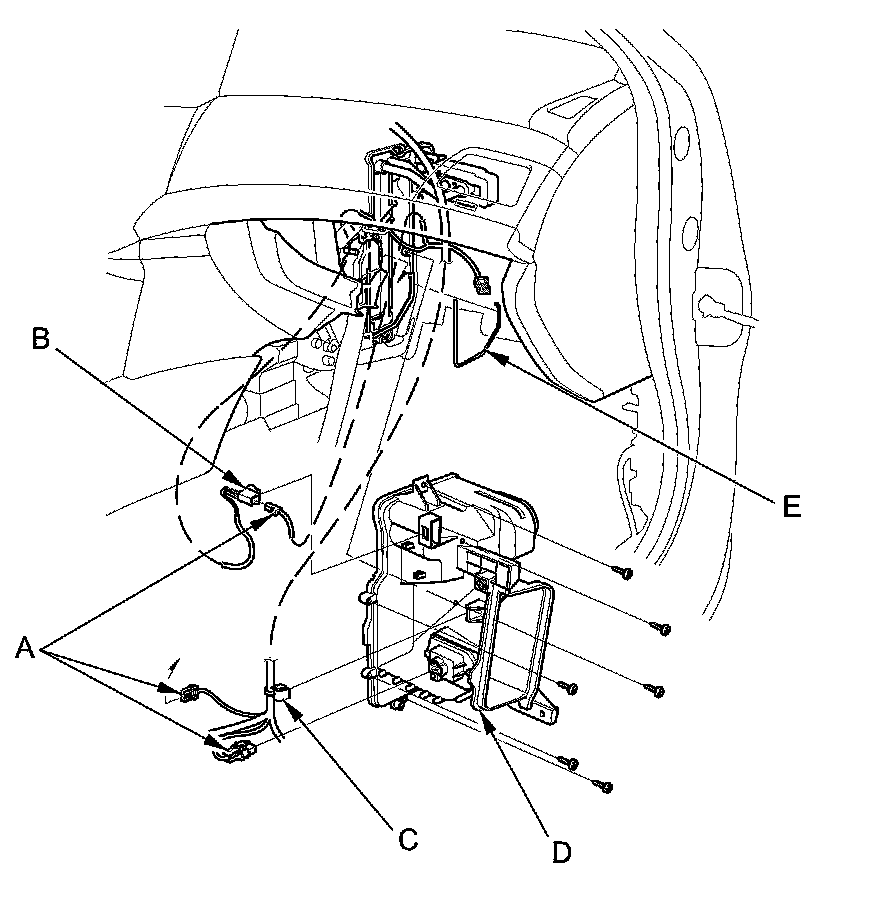 6. Disconnect these connectors (A): The evaporator temperature sensor, the power transistor, and the passenger's air mix control motor (with climate control). Detach the connector clip (B) and the harness clip (C). Remove the self-tapping screws, the expansion valve cover (D), and the seal (E).