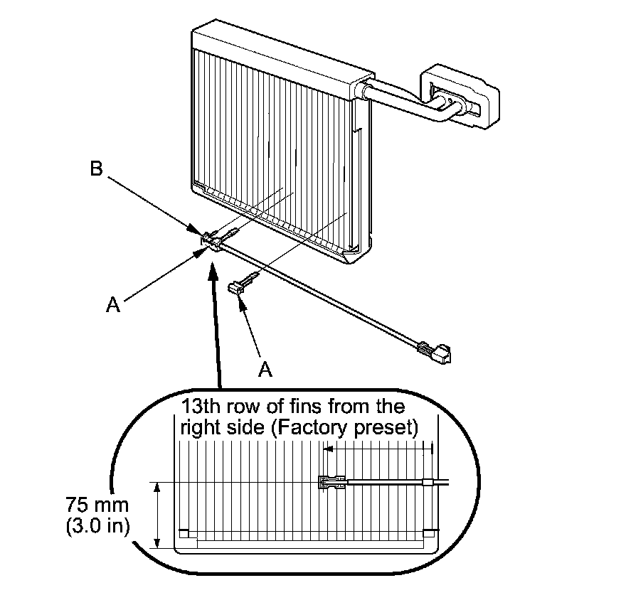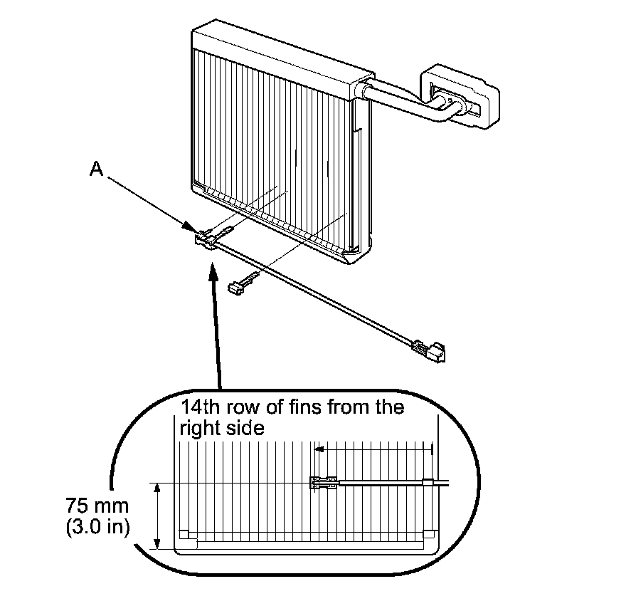 9. When the evaporator temperature sensor (A) is reinstalled onto a new evaporator core, set the evaporator temperature sensor in the 13th fin from the right side.