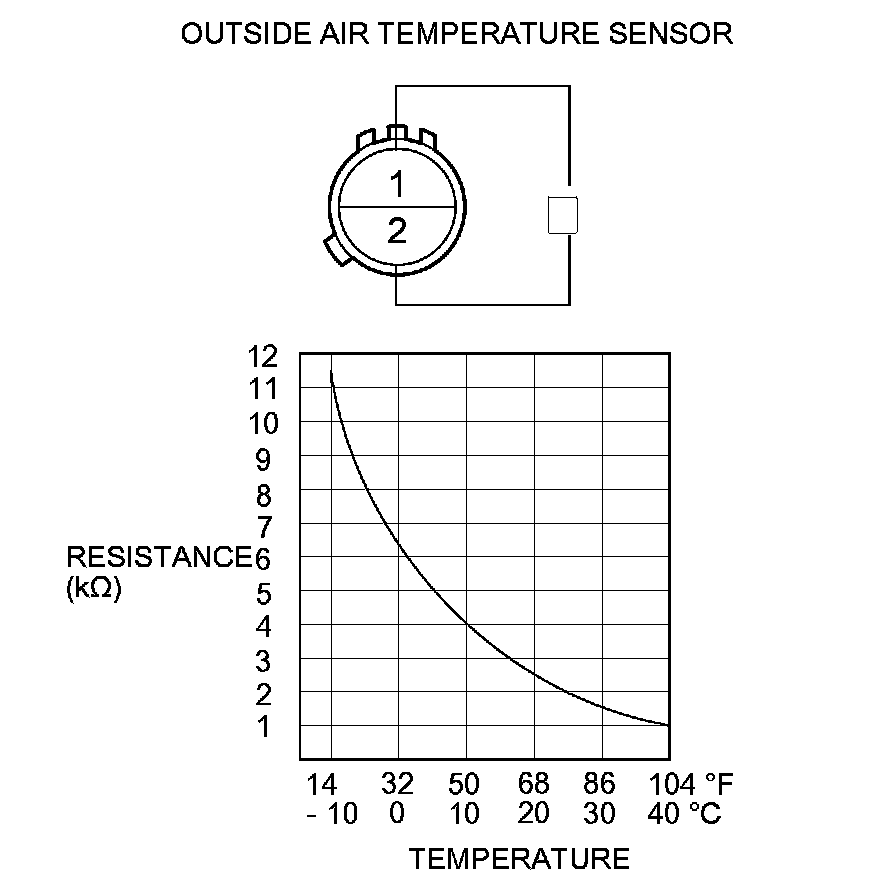 3. Compare the resistance reading between terminals No. 1 and No. 2 of the outside air temperature sensor with the specifications shown in the graph; the resistance should be within the specifications.