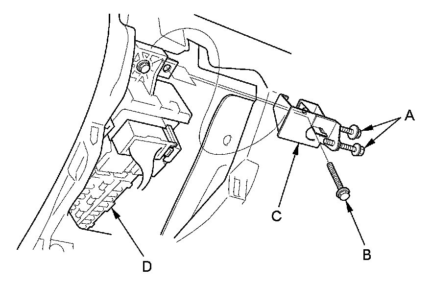 4. Remove the bracket from the driver's under-dash fuse/relay box (D).