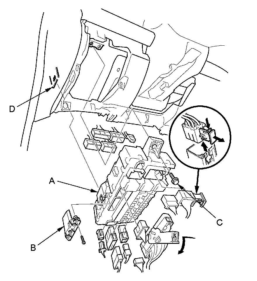7. Remove the mounting bolt (C), release the tab(D), and pull the driver's under-dash fuse/relay box away from the body.