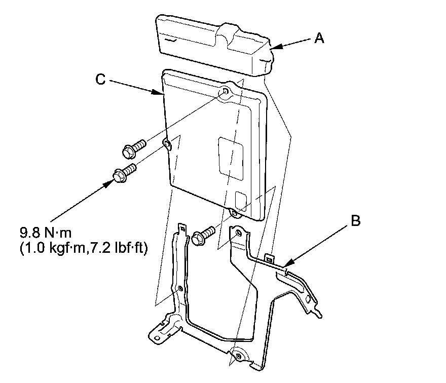15. Remove the cover (A) and the bracket (B) from the ECM/PCM (C).