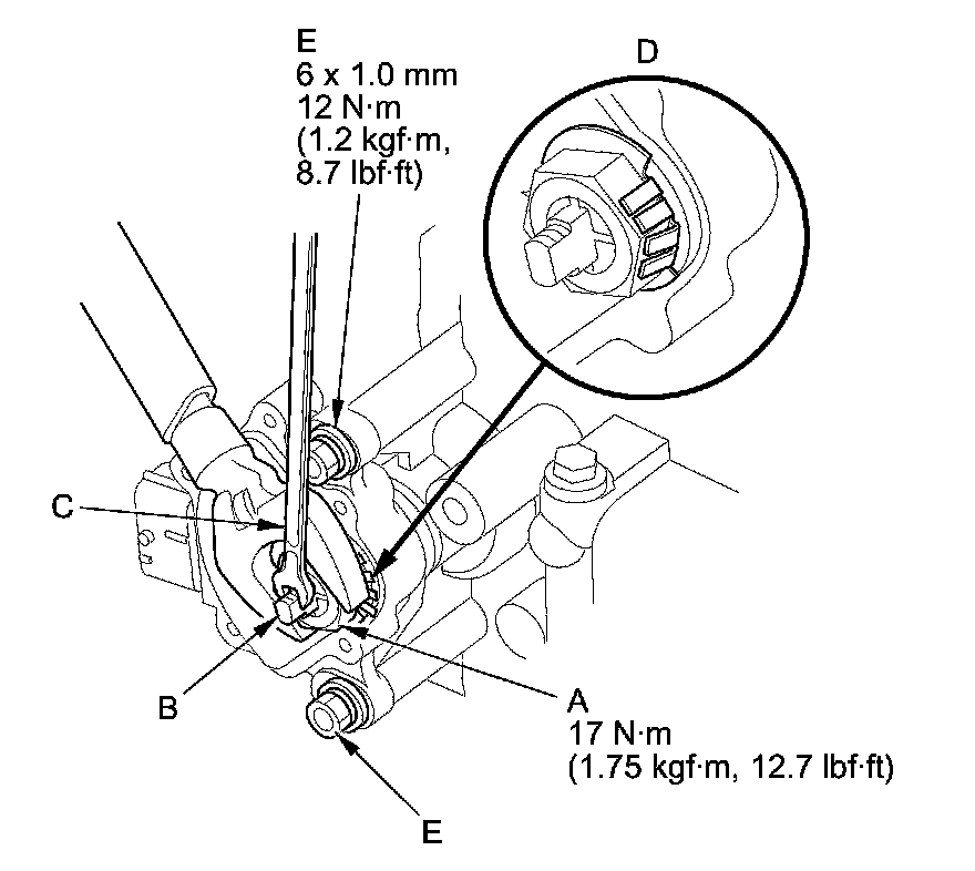 15. Push the locknut (A) against the transmission housing to seat the transmission range switch into the selector control shaft, and tighten the locknut to 17 Nm (1.75 kg-m, 12.7 lb-ft) while holding the selector control shaft (B) with a 6.0 mm wrench (C), then bend the lock tabs (D) of the lock washer against the locknut.