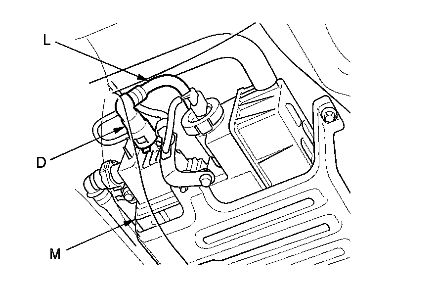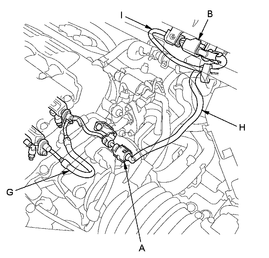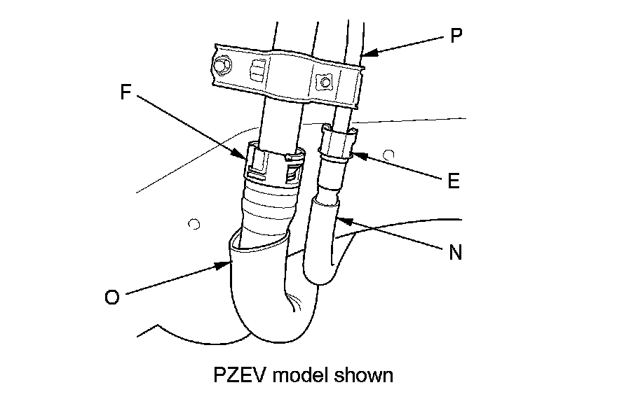 The fuel line/quick-connect fittings (A, B, C, D, E, and F) connect the fuel joint hose (G) to the fuel feed hose (H), the fuel feed hose to the fuel line (I), the fuel line (J) to the fuel tank unit (K), the fuel vapor line (L) to the EVAP canister (M), and the fuel tank vapor recirculation tube (N) (PZEV model, and fuel fill neck tube (O)) to the fuel fill pipe (P). When removing or installing the fuel feed hose, the fuel tank unit, or the fuel tank, when disconnecting/connecting the quick-connect fittings,
