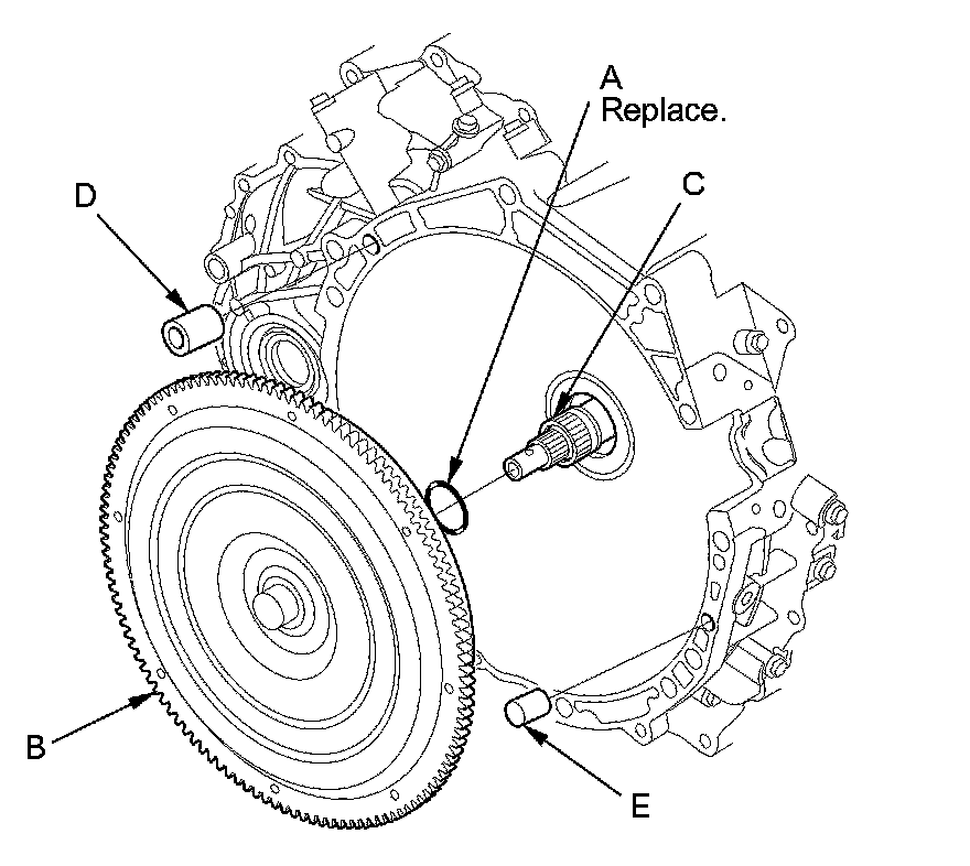 4. Install the 14 mm dowel pin (D) and the 10 mm dowel pin (E) in the torque converter housing.