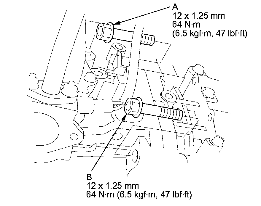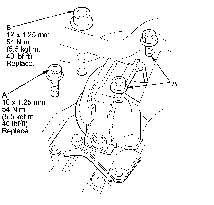 43. Secure the rear engine mount base bracket with new bolts: 10 x 1.25 mm (A) (three bolts) and 12 x 1.25 mm (B).