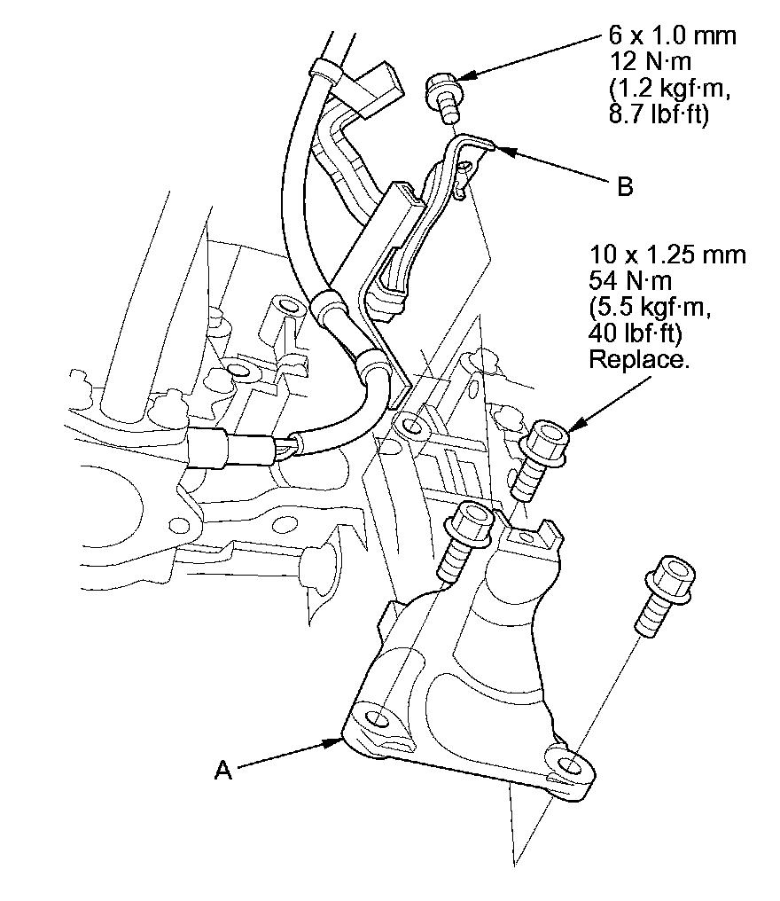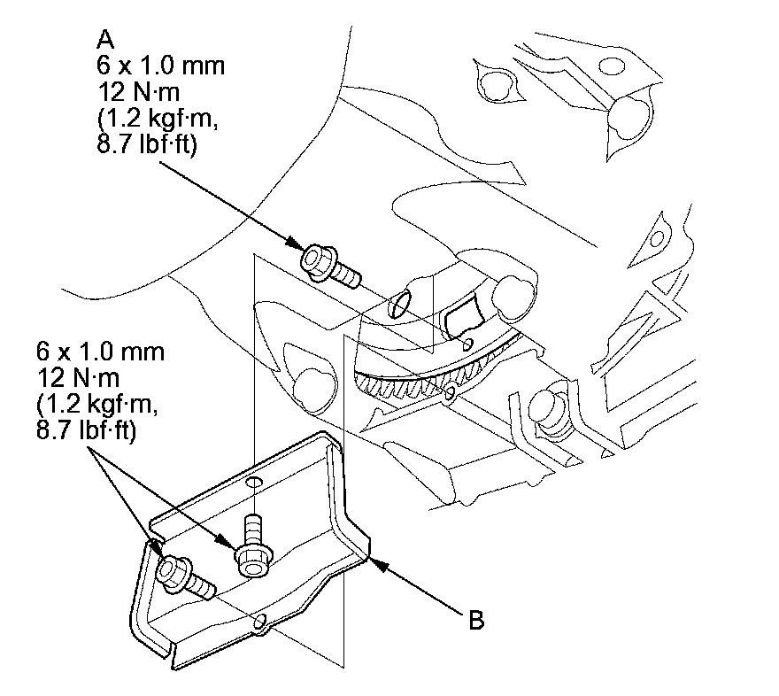 12. Install the sensor harness clamp bracket (B) on the front engine mount bracket.