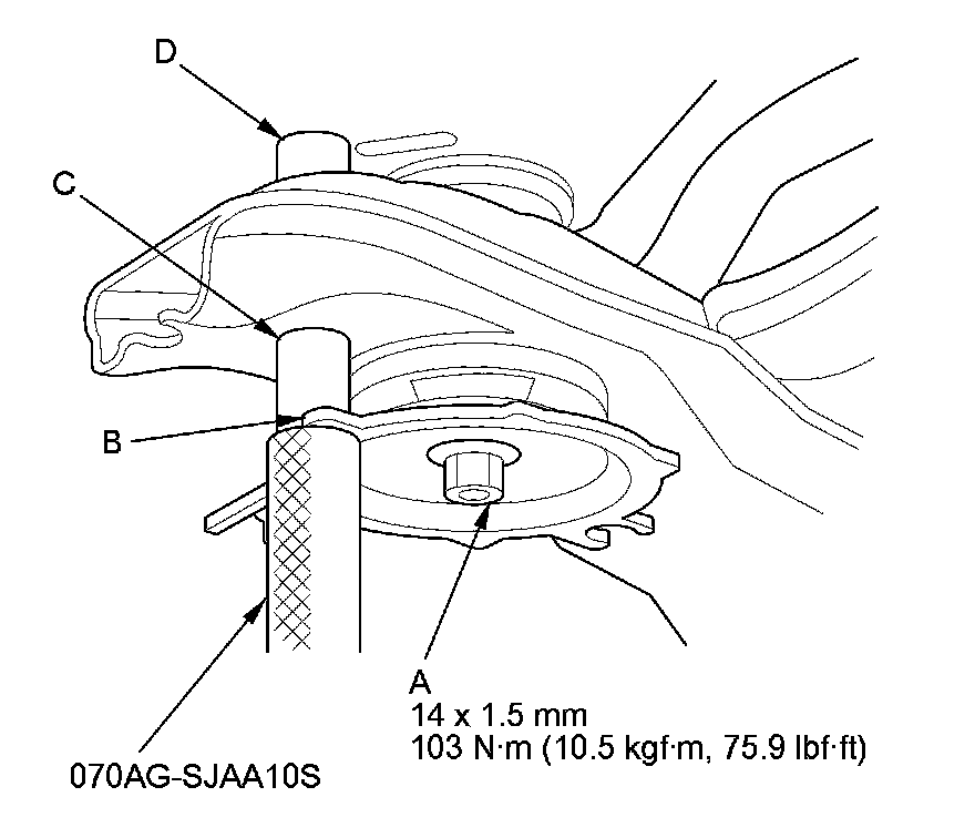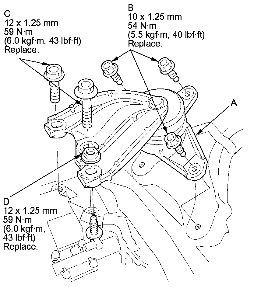 16. Loosely install new transmission upper mount bracket bolt (C) and nut (D) to the transmission housing.