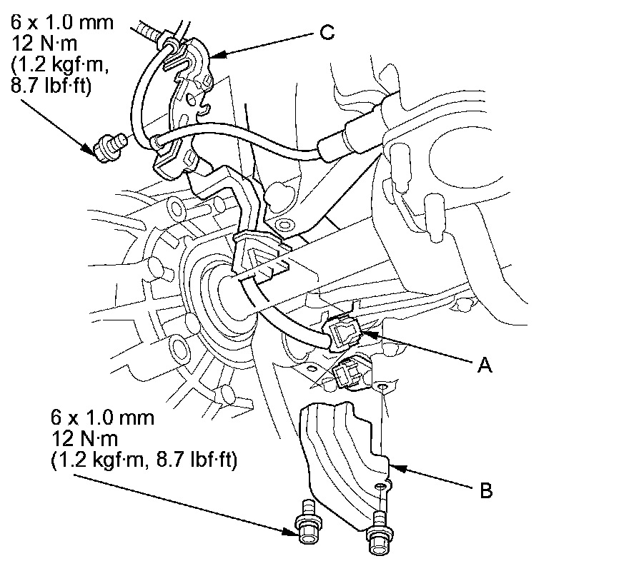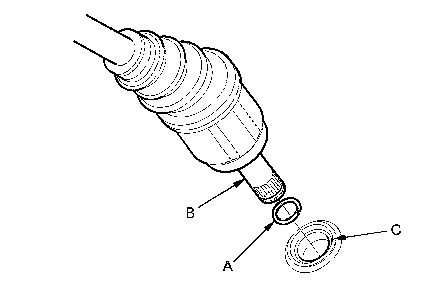 19. Apply ATF to the intermediate shaft splines, put the heat shield (C) on the intermediate shaft, then install the intermediate shaft; be sure not to allow dust or other foreign particles to enter the transmission.
