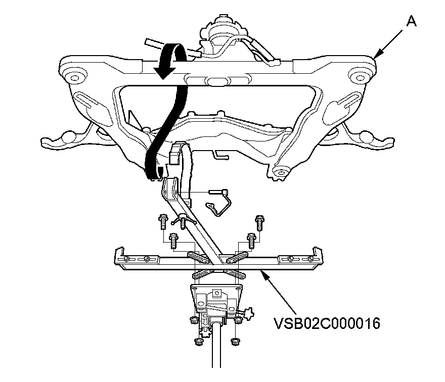 28. Support the front subframe (A) with the subframe adapter (VSB02C000016) and a jack.