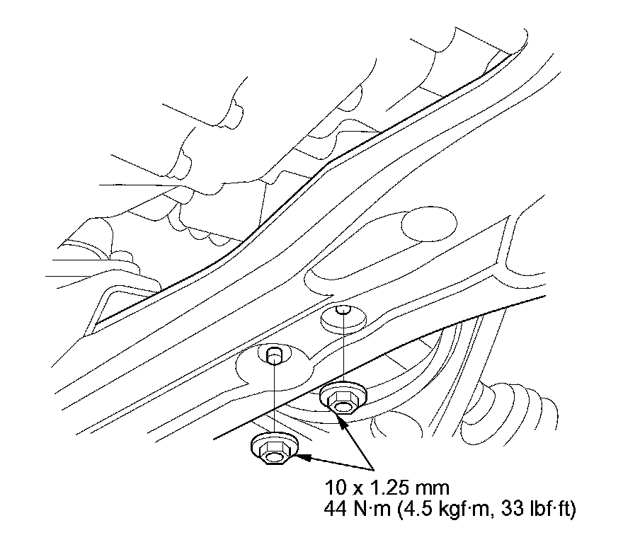 32. Loosely tighten the front subframe mounting bolt in the left rear stiffener in the same manner as in step 31 Automatic Transmission Installation.