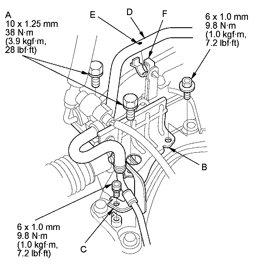 48. Secure the steering gearbox heat shield (B) and the power steering fluid line clamp (C) with the bolts. Install the power steering fluid hose (D) at the dot mark (E) in its clamp (F).