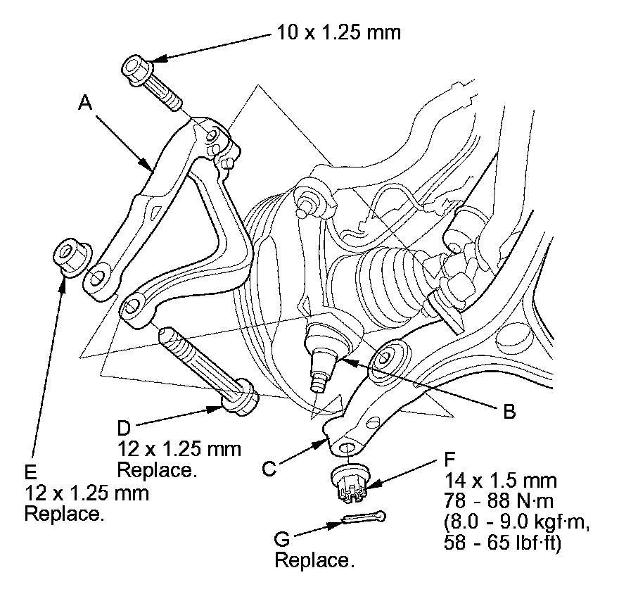 53. Install new damper fork bolts (D) and new self-locking nuts (E), and loosely tighten the self-locking nuts, then secure the ball joints with the castle nuts (F) and new cotter pins (G).