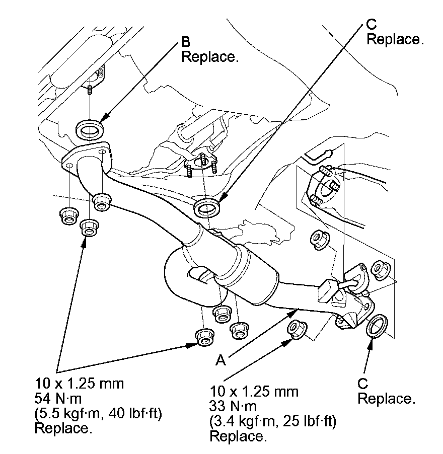 54. Install exhaust pipe A with new self-locking nuts and new gaskets (B) (C) Service and Repair.