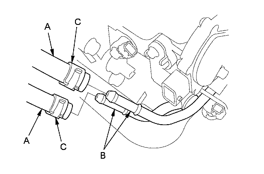61. Connect the ATF cooler hoses (A) to the ATF cooler lines (B), and secure the hoses with the clips (C) Service and Repair.