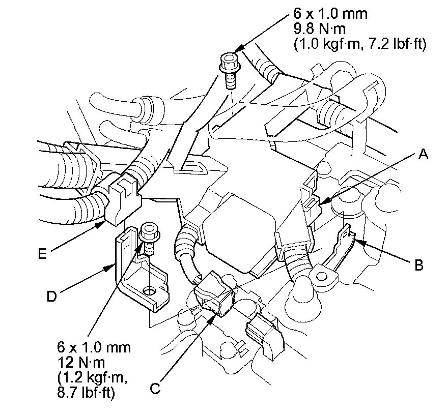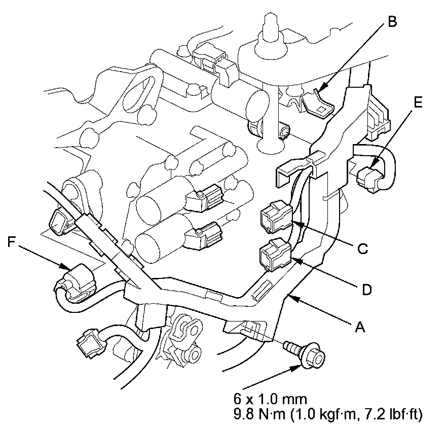 70. Connect the A/T clutch pressure control solenoid valve A connector (C), the A/T clutch pressure control solenoid valve B connector (D), the 4th clutch transmission fluid pressure switch connector (E), and the shift solenoid wire harness connector (F).