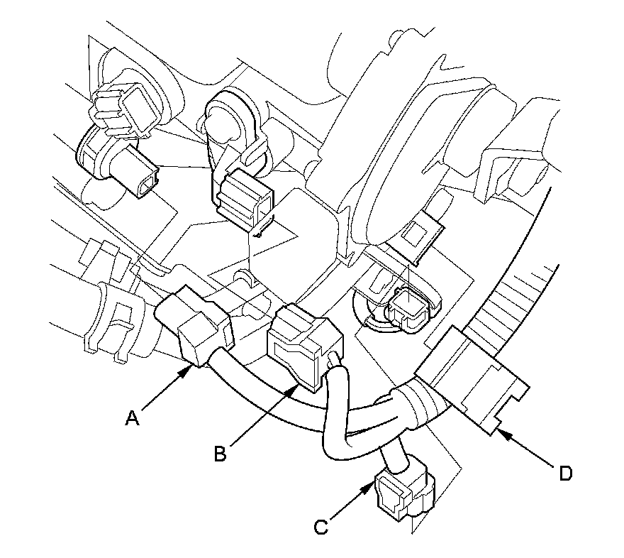 67. Connect the transmission fluid pressure switch B (3rd clutch) connector (A), the output shaft (countershaft) speed sensor connector (B), and the ATF temperature sensor connector (C). Install the harness clamp (D) on its bracket.