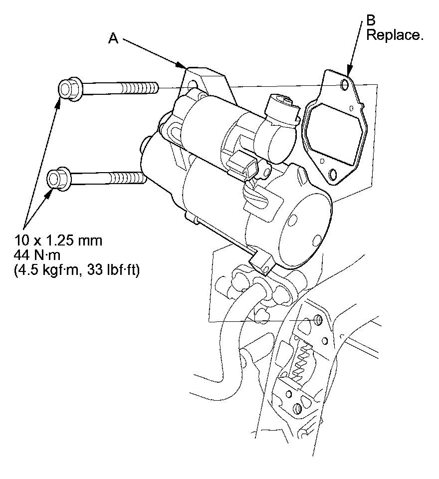 74. Install the starter (A) and a new gasket (B).
