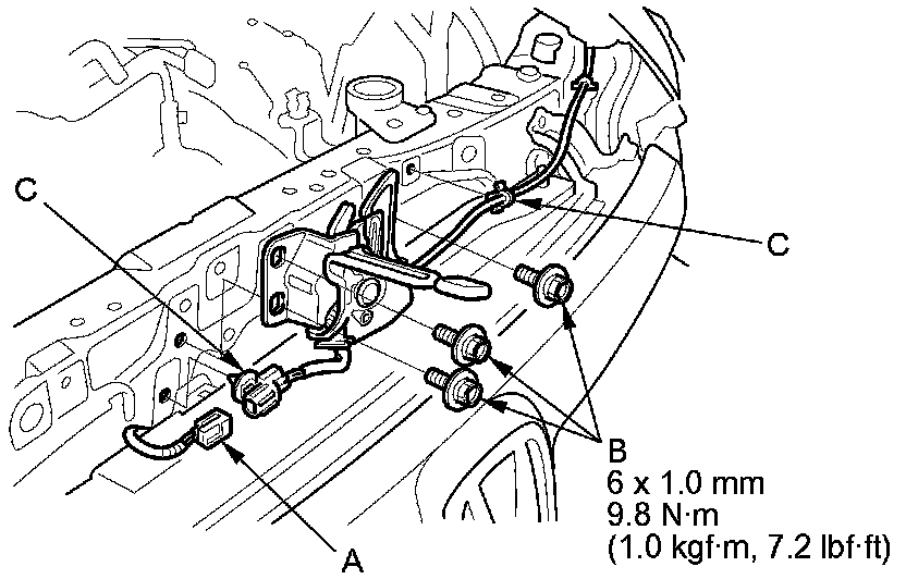 10. Disconnect the hood latch switch connector (A), then remove the mounting bolts (B) and the clamps (C).