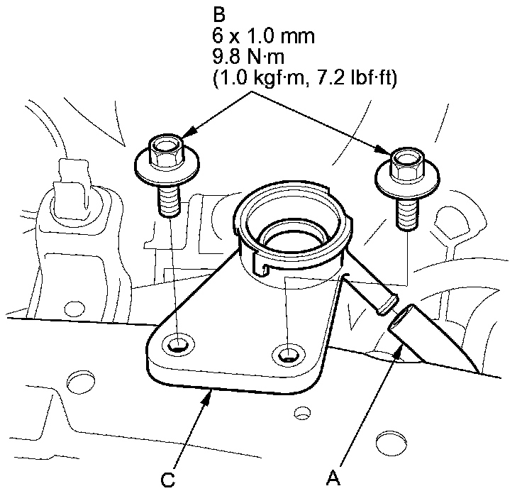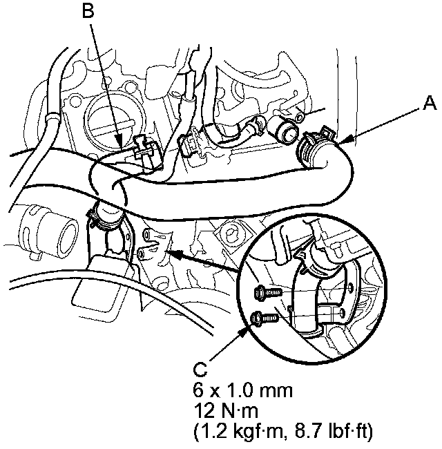 14. Disconnect the upper radiator hose (A) and the lower radiator hose (B), then remove the water lower pipe mounting bolts (C).