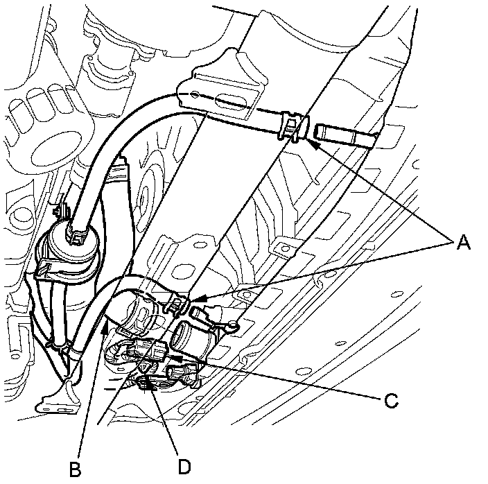 18. Disconnect the engine coolant temperature (ECT) sensor 2 connector (C), then remove the clamp (D).