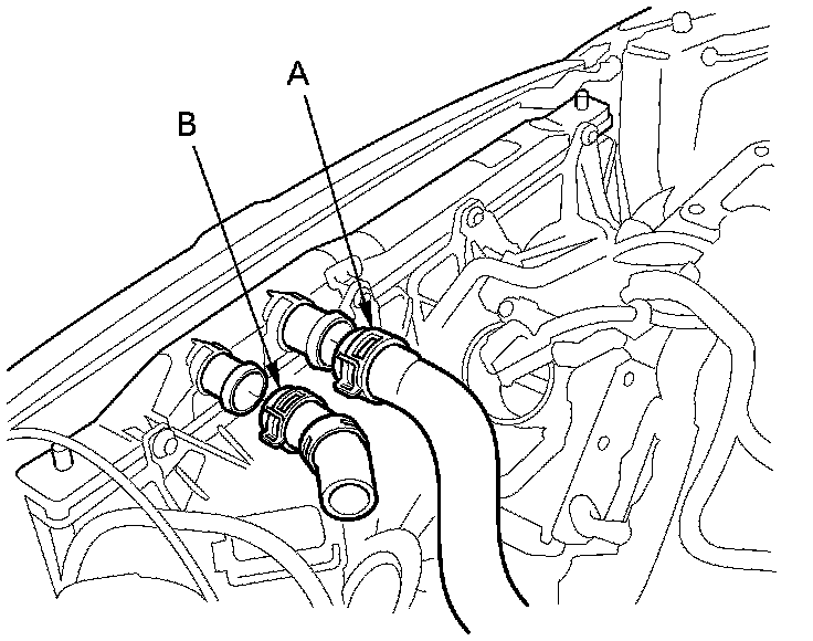 17. Disconnect the ATF cooler hoses (A) and the lower radiator hose (B).