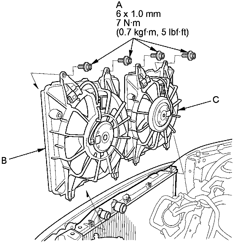 21. Remove the mounting bolts (A), then pull up the radiator fan shroud assembly (B) and the A/C condenser fan shroud assembly (C).