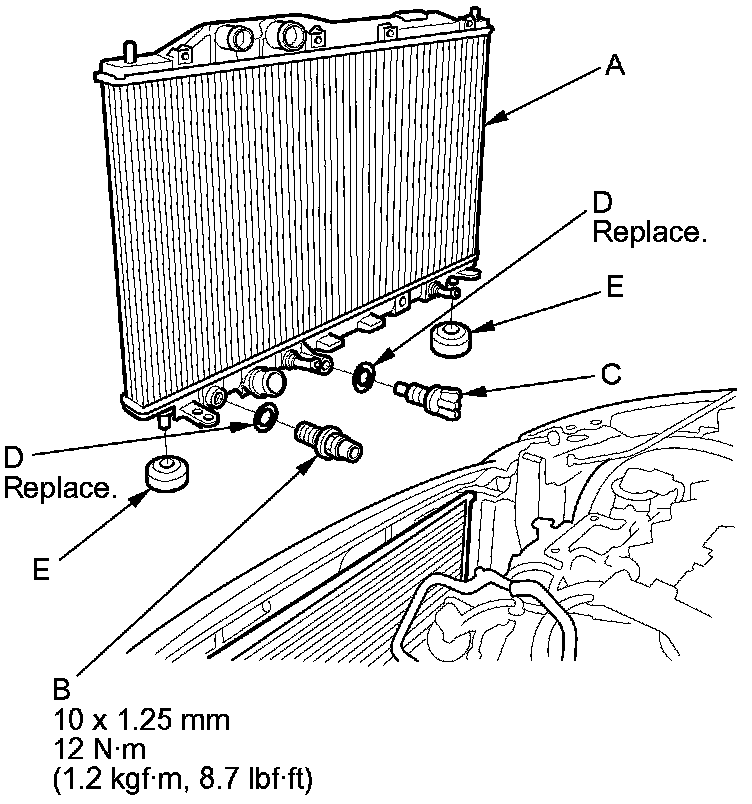 22. Pull up the radiator (A), then remove the ECT sensor 2 (B), the drain plug (C), the O-rings (D), and the lower cushions (E).