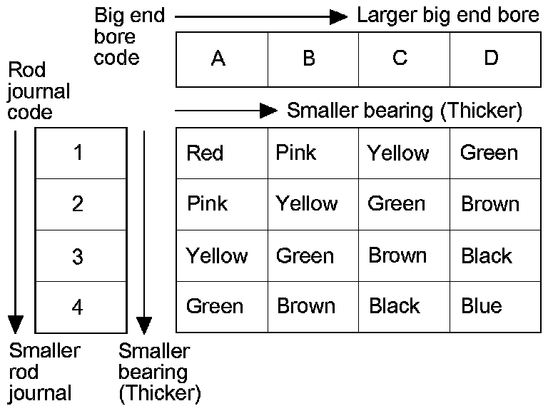 4. Use the big end bore codes and the rod journal codes to select appropriate replacement bearings from the following table.