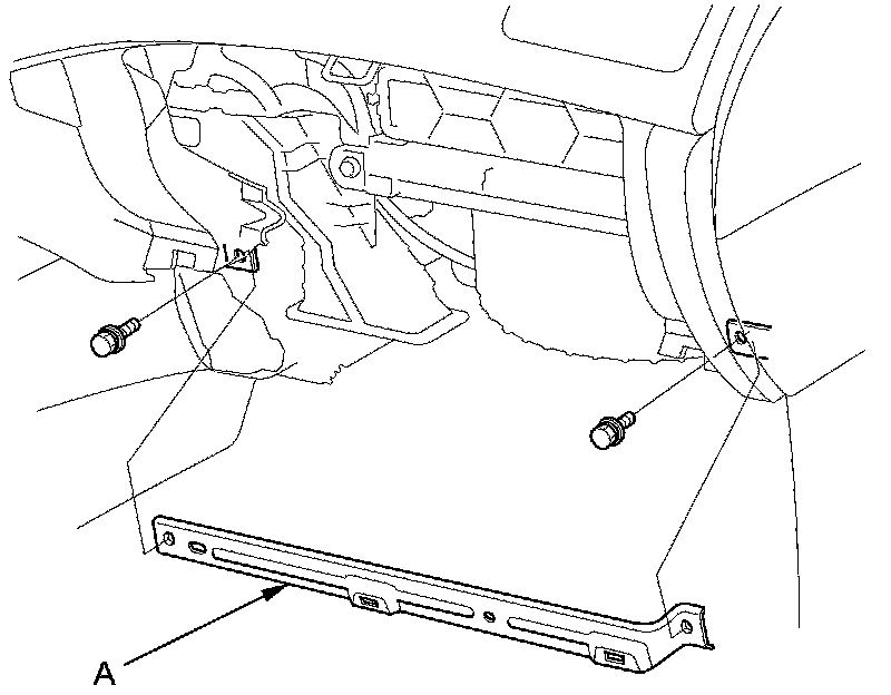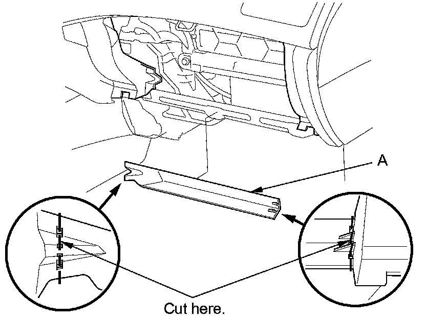 2. Cut the plastic cross brace (A) in the glove box opening with diagonal cutters in the area shown, and discard it.