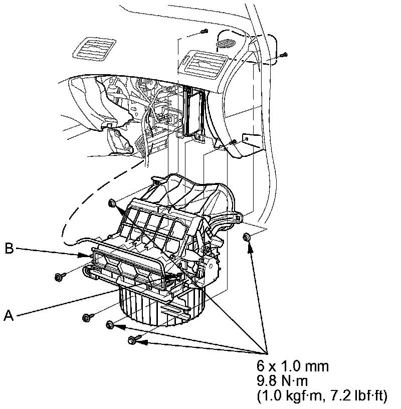 6. Disconnect the connector (A) from the recirculation control motor. Remove the self-tapping screws, the bolt, the mounting nuts, and the blower unit (B).