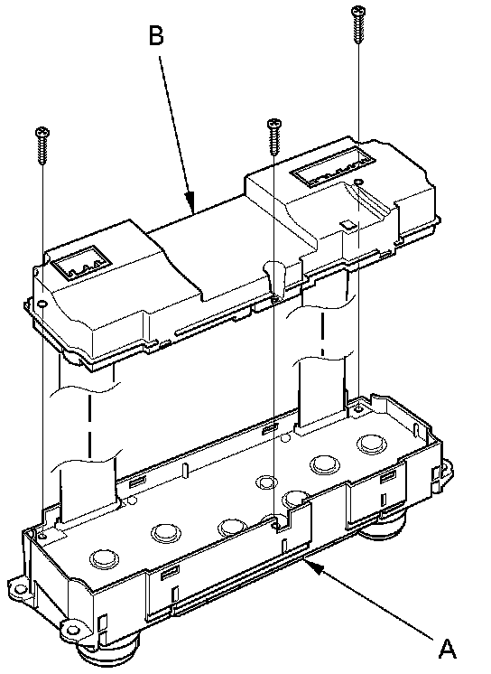 3. Remove the self-tapping screws, then carefully separate the climate control unit display (A) from the control unit (B). Do not kink or pull on the wires between the display and the control panel. Do not touch the electronic components on the printed circuit board in the control panel.