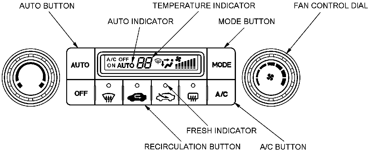 2. Press and hold the AUTO and RECIRCULATION buttons, turn the ignition switch to ON (II), then release the AUTO and RECIRCULATION buttons.