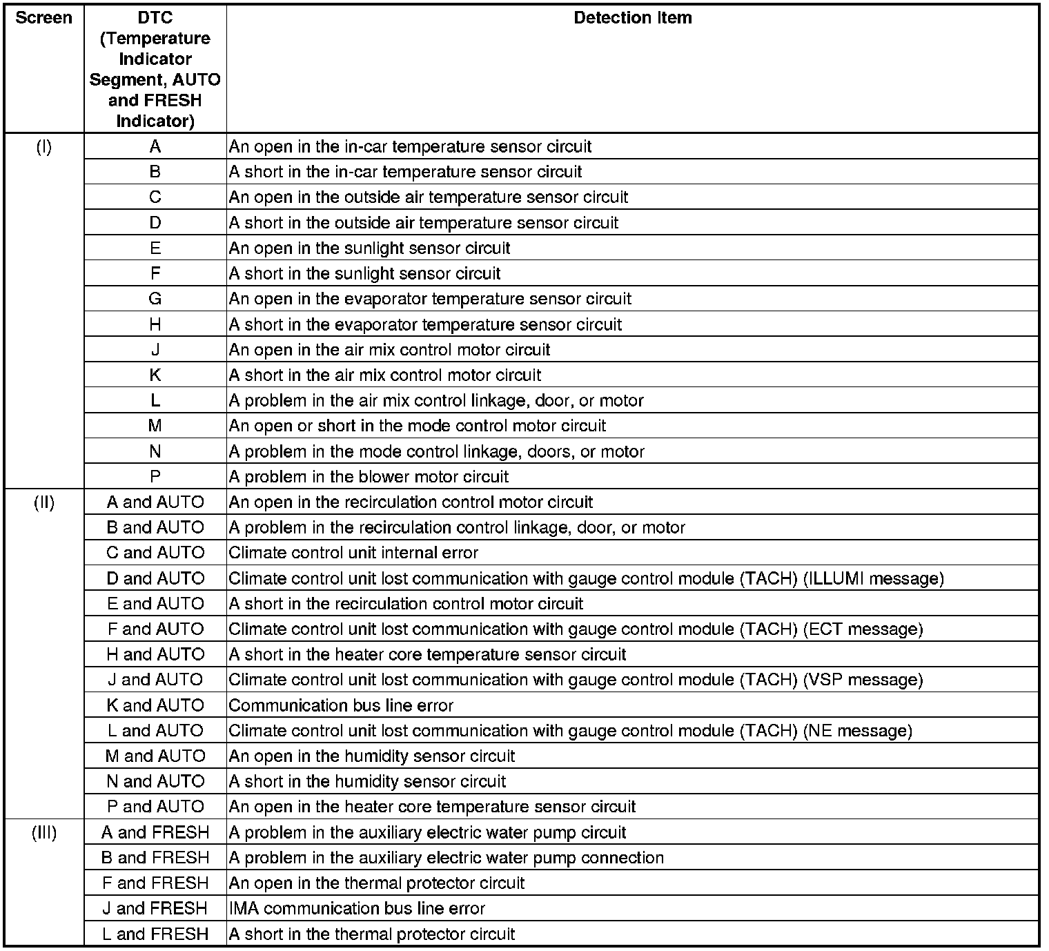 - If the DTC is displayed on screen III (the FRESH indicator comes on in screen III), the system alternately flashes "AUTO 88" and one or more of segments A through P.