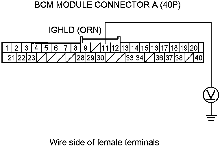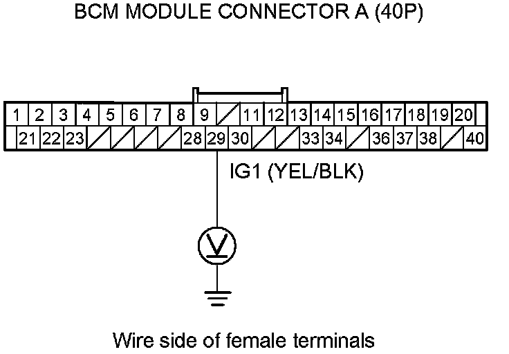 12. Measure the voltage between body ground and BCM module connector terminal A29.