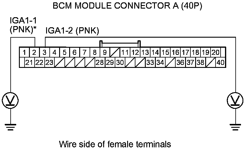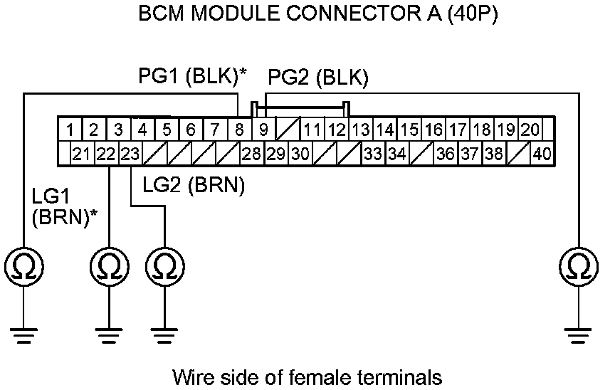 19. Check for continuity between body ground and BCM module connector terminals A8*, A9, A22*, and A23 individually.